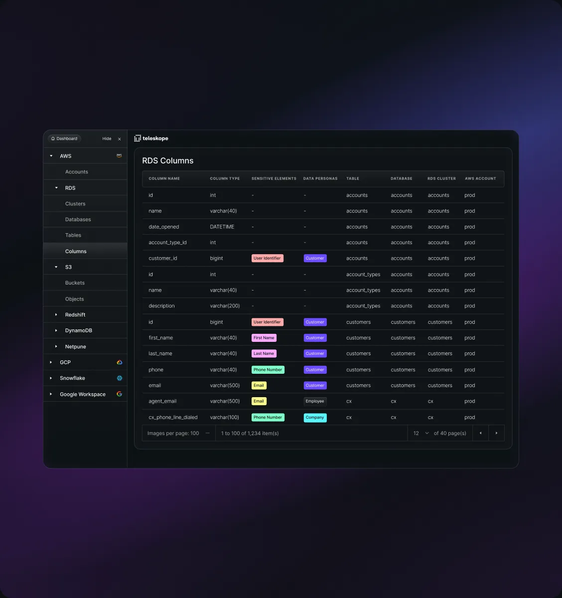 Teleskope discovers and inventories all of data assets across your cloud, on-premise or third party systems. Our classification pipeline will automatically detect over 150 types of regulated and proprietary data, including PII, PCI, PHI, and secrets
