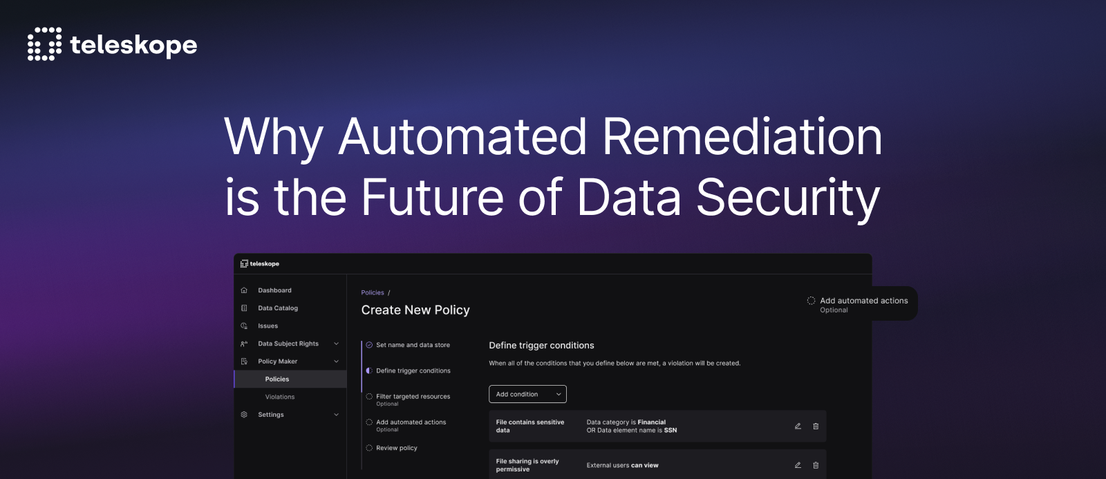 - Automated remediation and policy enforcement, driven by your custom rules. Once sensitive data is identified, Teleskope can automatically redact, encrypt, mask, or restrict access without manual intervention. You have the ability to view, monitor, and approve enforcement actions in real-time.